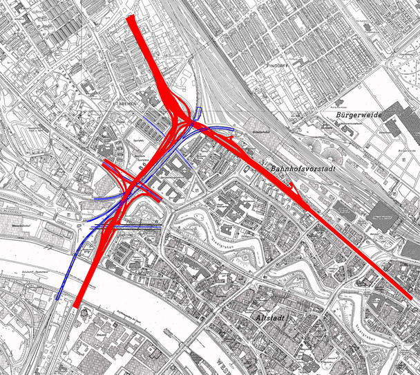 …folgt der Logik einer Ringstraßen-Erschließung der 1960er um das Zentrum von Bremen. Diese Logik setzt sich fort im Verkehrsknoten Breitenweg und der Hochstraße Richtung Remberti-Ring, dessen Notwendigkeit heute niemand ernsthaft verteidigen kann, lediglich die Abriss-Kosten werben für den Erhalt dieses Bauwerks. Für die brachgefallene Gleisharfe in Richtung Findorf erzeugten ‚urbanisierte Nachbarn’ Utbremen und Bahnhofsvorstadt einen Paradigmenwechsel, der diesen Bereich in den Fokus einer wertvollen innerstädtischen Entwicklungsfläche rücken würde. Das Stephaniekirch-Viertel könnte aus seiner ‚Dorflage’ gelöst, in die Innenstadt reintegriert werden und die Überseestadt konkurrierte ernsthaft mit Lagen, wie die Stadtviertel zwischen Steintor und Ostertor. Der Stadtteil Utbremen wird derzeit bis hinüber nach Walle vom überregionalen Verkehr verwüstet.