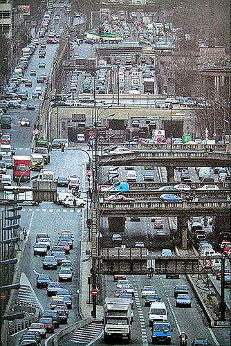 L’intérieur et l’extérieur de la ville de Paris se définissent à partir de son ’Boulevard périphérique‘ qui donne à la ville sa forme emblématique. Cette ceinture, qui a pris sa forme actuelle dans les années 1960 aussi, constitue comme une ligne de démarcation entre deux espaces mentaux. L’intérieur, espace de grandes pensées et de visions de vaste portée, l’univers du Livre des passages de Walter Benjamin, est en réalité de dimension réduite et peut se traverser à pied en moins de trois heures ou se parcourir en vélo le long de son pourtour intérieur dans le même temps. L’extérieur au contraire sans fin était jusque-là réservé aux petites pensées de moindre portée, aux décisions rapides ‚extra muros‘ expédiées entre les restes de la banlieue scindée. On est ici au royaume de l’illimité, la ville décompose en unités de géants et de nains, séparées et juxtaposées sur un mode autistique, non pas intégrées dans un espace commun, mais reliées par les fils d’une systématique circulatoire (« flowchart-traffic » /organigramme de trafic automobile).