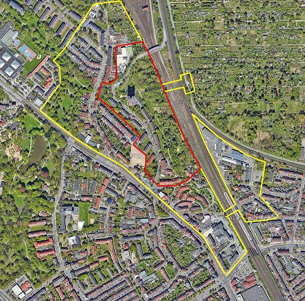 Entwurfsgebiet: Projekt-Rahmen (rot) und unmittelbarer Betrachtungsraum (gelb)