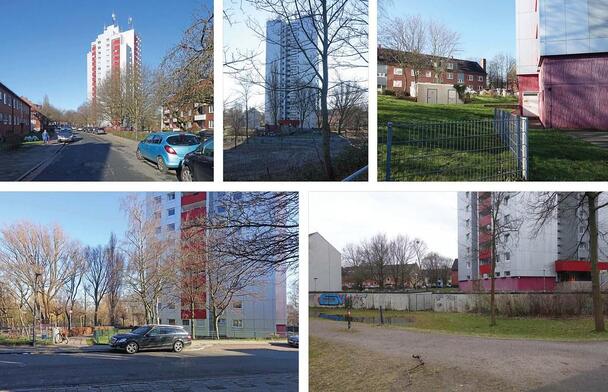 Von innen: Die spannende Höhenentwicklung des Geländes entlang der Waller Straße, der Brücke über die Bahn, seiner Dammlage und einer Senke neben dem Hochhaus beträgt fast 10 m. Die Stellung vieler Gebäude bezieht sich nicht auf den öffentlichen Raum, sondern sucht – in gewissermaßen kompositorischer Ordnung – nach einer Nord-Süd-Ausrichtung. Dabei kollidiert eine historische Bockrandorientierung bestimmter Bauten mit einer Freiraumorientierung anderer auf engstem Raum.